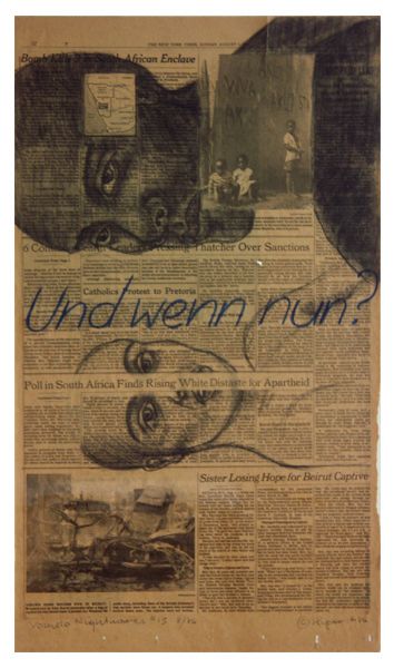 1986. Charcoal and oil crayon drawing on New York Times page from Sunday, August 3, 1986. 23 1/2" x 13 3/5" (59,6 cm x 34,5 cm). #86006. Private collection. © APRA Foundation Berlin.