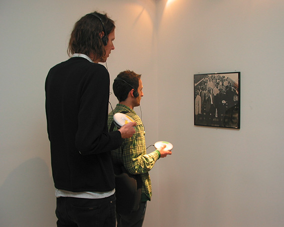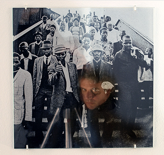 black and white photograph framed under reflective Plexiglas, 18 x 18” (45.7 x 45.7 cm); audio tape, lighting.